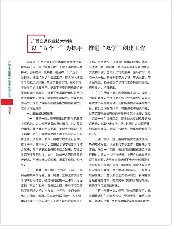 学校党委办公室、党委宣传部党支部根据自身特点,创新载体,抓特色,创品牌,以“五个一”为抓手,推进“双学”创建工作,持续深入推动学习型党员队伍、学习型党组织建设,营造了重视学习、崇尚学习、坚持学习的浓厚氛围,提高了党员的思想政治理论素质和科学文化素养,提高了党员履行岗位职责的水平和能力,提升了党组织的服务能力和创新能力。