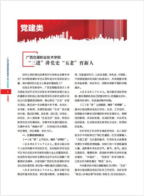 11月28日,自治区交通运输厅公布2022年广西交通运输行业党建及宣传思想工作创新案例名单,我校报送的离退休党总支《“三进”讲党史 “五老”育新人》和党宣传支部《以“五个一”为抓手 推进“双学”创建工作》工作案例,从全区交通系统报送的工作案例中脱颖而出,成功入选39个创新工作典型案例。