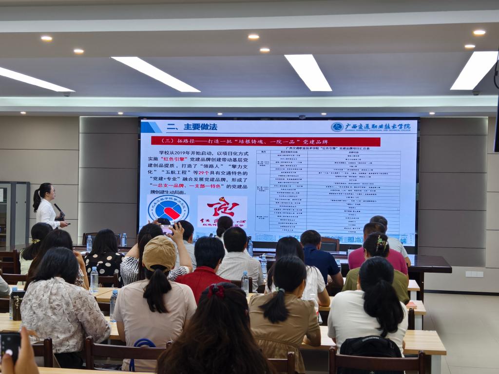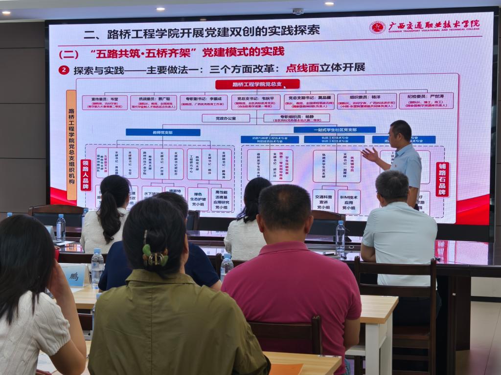 第四批全国高校党建工作标杆院系培养创建单位路桥工程学院党总支书记韦秋平、第三批全国高校党建工作标杆院系汽车工程学院党总支书记陆芸,各学院专职组织员等相关人员陪同调研交流。