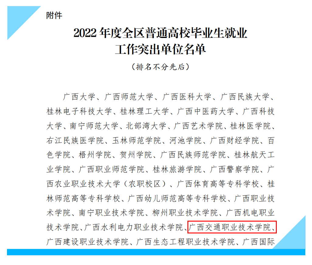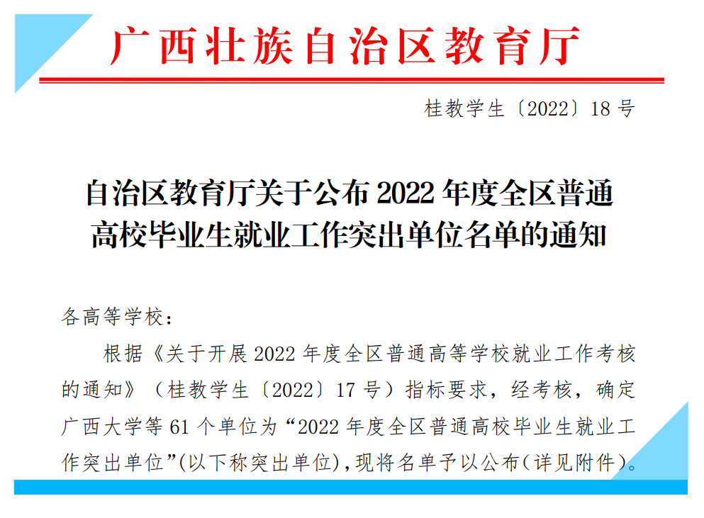 日前,自治区教育厅公布了《关于公布2022年度全区普通高校毕业生就业工作突出单位名单的通知》(桂教学生〔2022〕18号),我校经考评确定为“2022年度全区普通高校毕业生就业工作突出单位”。自2002年升格为高职高专院校以来,我校已连续二十年获此殊荣。