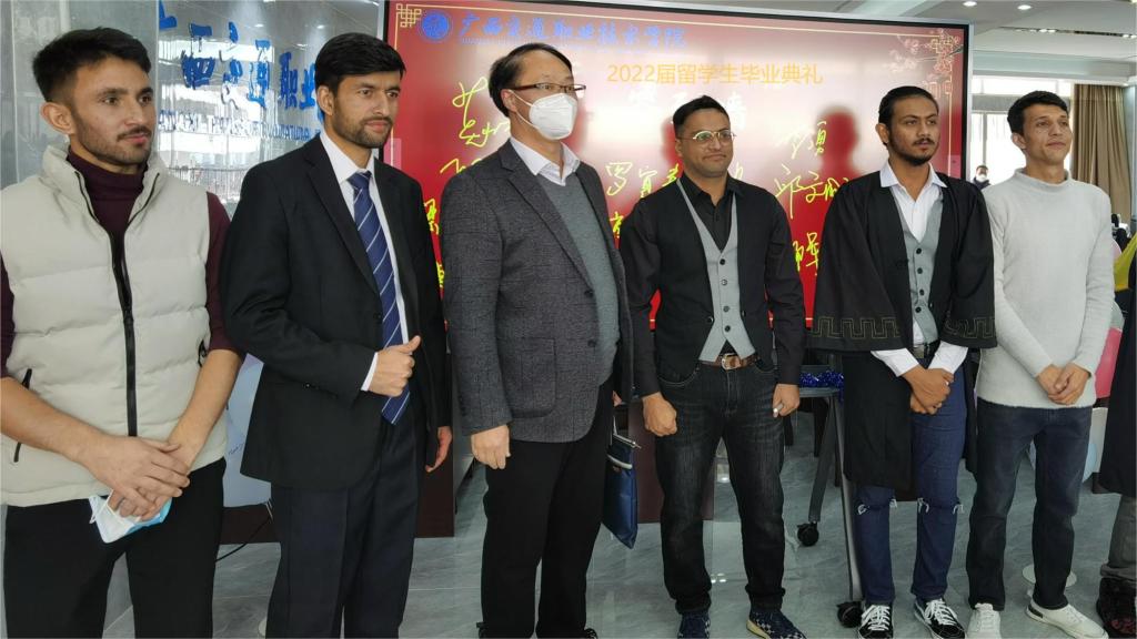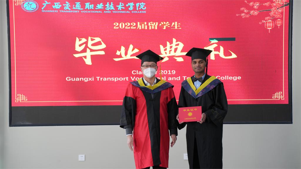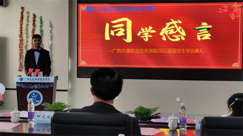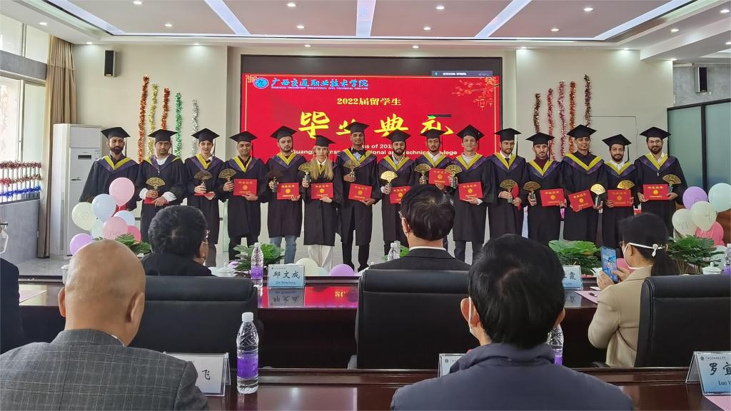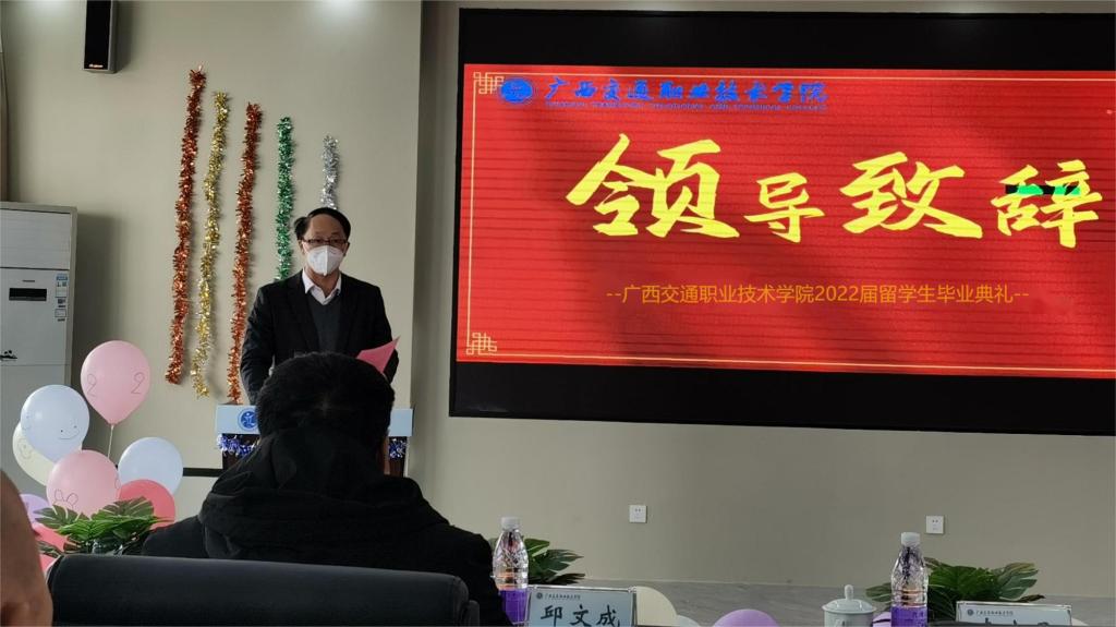 12月31日,我校首届留学生毕业典礼在园湖校区图书馆四楼会议室隆重举行。学校校长李文勇,党委办公室主任、党委宣传部部长韦耀,教务处处长黄云奇,学生工作处处长邱文成,招生就业处处长何江霞,汽车工程学院院长刘学军,经济管理学院院长杨军,工会常务副主席黎明,驾校校长吴飞,团委副书记林波,东盟国际学院院长莫小农等领导出席典礼。留学生汉语教师、各专业任课老师、东盟国际学院全体老师、2022届全体留学生、学校2020-2022级国际学生代表等近50人参加毕业典礼。