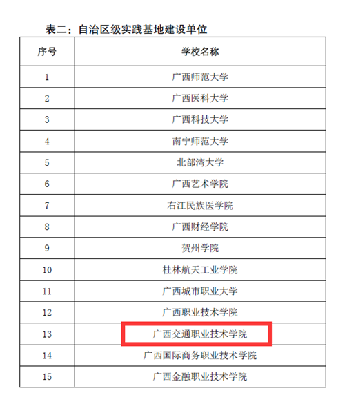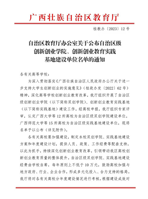 日前,自治区教育厅公布了《自治区教育厅办公室关于公布自治区级创新创业学院、创新创业教育实践基地建设单位名单的通知》(桂教办〔2023〕12号),我校经评审被认定为自治区级创新创业教育实践基地建设单位,成为全区四所高职高专层次实践基地建设单位之一,这也是我校在创新创业教育改革取得的又一丰硕成果。