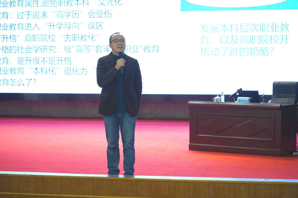 当天下午,广东番禺职业技术学院樊明成教授就发展本科层次职业教育的理性认知、现实考量与路径策略进行讲座。讲座内涵丰富、深入浅出、案例详实,内容涵盖我国本科层次职业教育的发展、发展本科层次职业教育的理性认知、我国发展本科层次职业教育的现实考量、高职专科争创本科层次职业学校的路径与策略等方面。