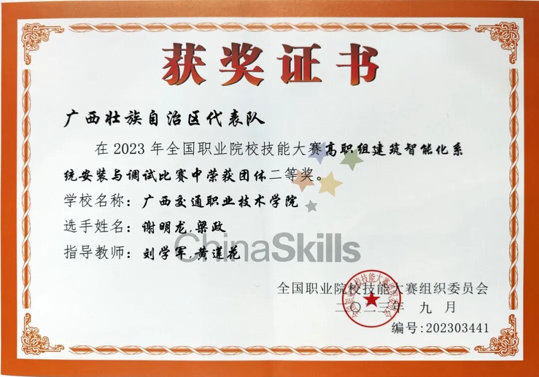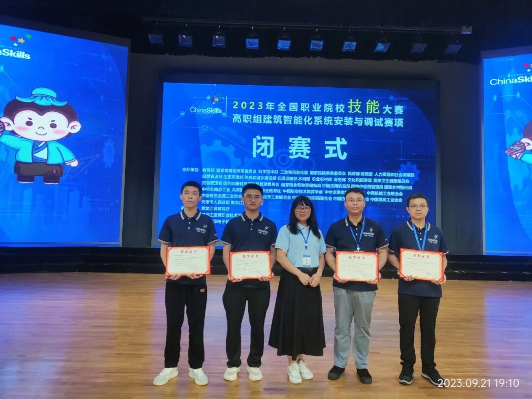 “很高兴,首次参赛就获得了二等奖。但也有遗憾,未能达到预定比赛目标,但作为一名职教战士,信心绝不能丢,绝不轻易屈服,总结经验,争取下次再干,做到干必成。”在刚刚落幕的2023年全国职业院校技能大赛“建筑智能化系统安装与调试”赛项获得二等奖的林土淦老师说到。2023年9月17-21日,为期5天的比赛,共有65所学校派出参赛队,300多名选手参赛为期5天,分为教师赛、学生赛两个组别。我院派出了林土淦教师和谢明龙、梁政2名学生参赛,经过激烈角逐,均获得国家二等奖。