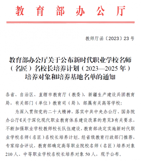 据悉,教育部计划从2023年开始实施新时代职业学校名师(名匠)名校长培养计划,简称职教“三名”计划,计划每年遴选一批中等职业学校校长和高等职业院校(含本科层次和专科层次)从事一线教育教学的在职在岗骨干教师或具有绝招绝技的技能大师,进行为期三年的集中培养。
