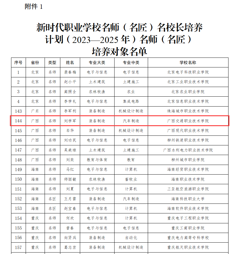 近日,教育部公布了新时代职业学校名师(名匠)名校长培养计划(2023—2025年)名师培养对象名单,确定了高等职业院校名师(名匠)培养对象210人。广西共有5人入选,我院刘学军教授名列其中。