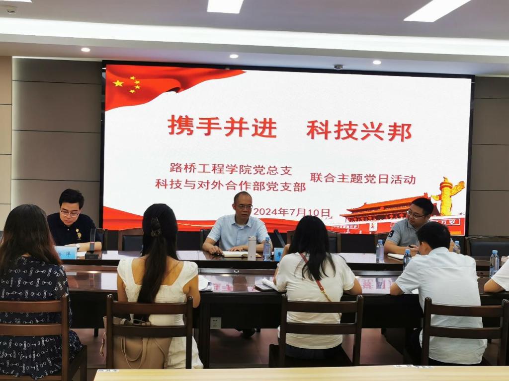 (路桥讯)为进一步推动学院科研创新与提升社会服务能力,加强教师队伍建设,促进学术交流与合作。7月10日,路桥工程学院党总支与科技与对外合作部党支部在路桥大楼519会议室联合开展了“携手并进,科技兴邦“主题党日活动。科技与对外合作部主任覃峰教授、学院杨洋副院长、科技与对外合作部主任助理陈其龙老师出席会议。科技与对外合作部党支部与学院党总支二十余名党员老师参加会议。