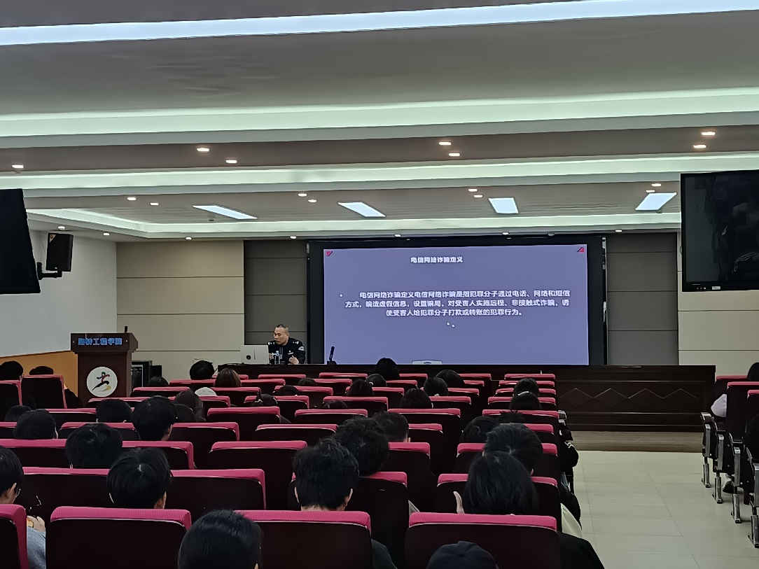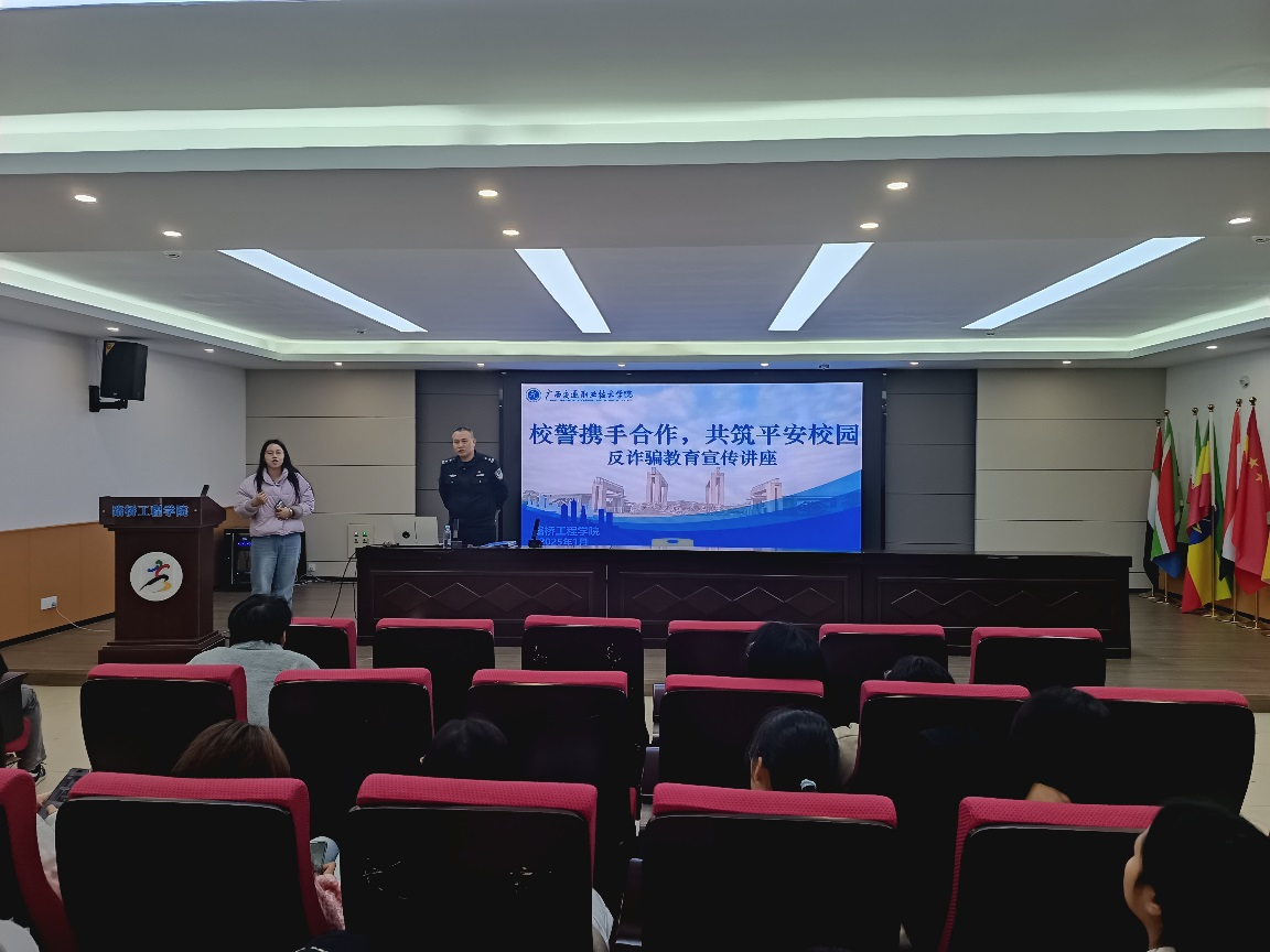 (路桥讯)为增强学院师生的反诈意识,提高自我防范能力,有效遏制电信网络诈骗案件的发生,近日,路桥工程学院举办了主题为“校警携手合作,共筑平安校园”的反诈骗教育宣传讲座,邀请了南宁市公安局三塘派出所黄巨杰警官为学院师生做防诈培训。本次讲座由刘湘伶老师主持,学院全体辅导员及23、24级200余名学生代表参加讲座。