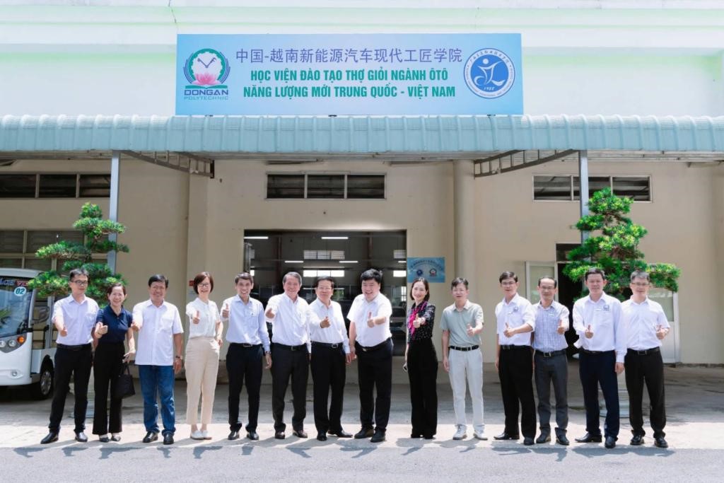 代表团在“中国—越南新能源汽车现代工匠学院”实训基地前与同安高科技学院领导合影