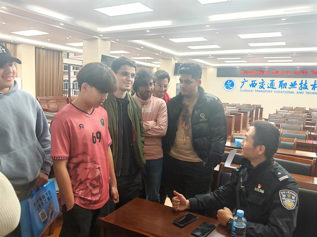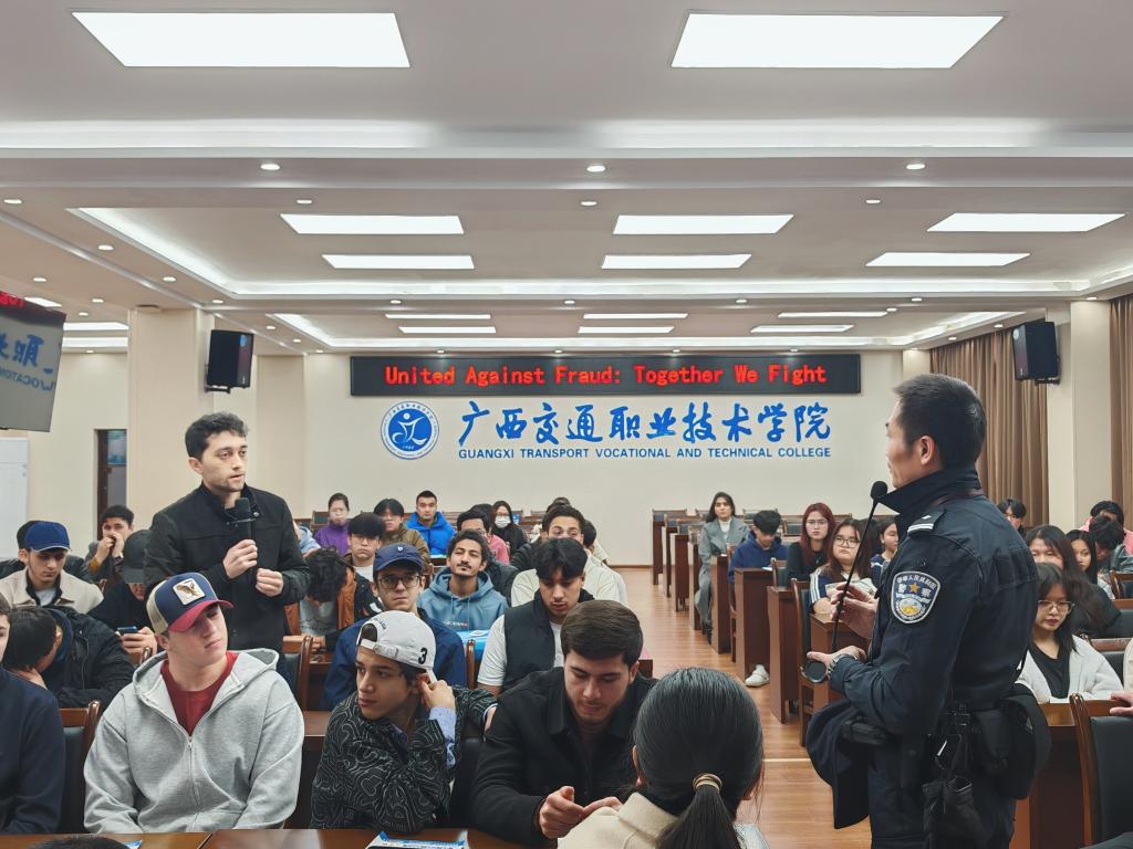 2025年3月7日,广西交通职业技术学院迎来了一场别开生面的安全主题教育培训活动,新城派出所、南宁市出入境管理局等单位的警官受邀来到学校,以生动有趣的方式为国际学生们带来了一场关于预防电信诈骗的知识盛宴,为国际学生筑起一道坚实的防电诈防线。