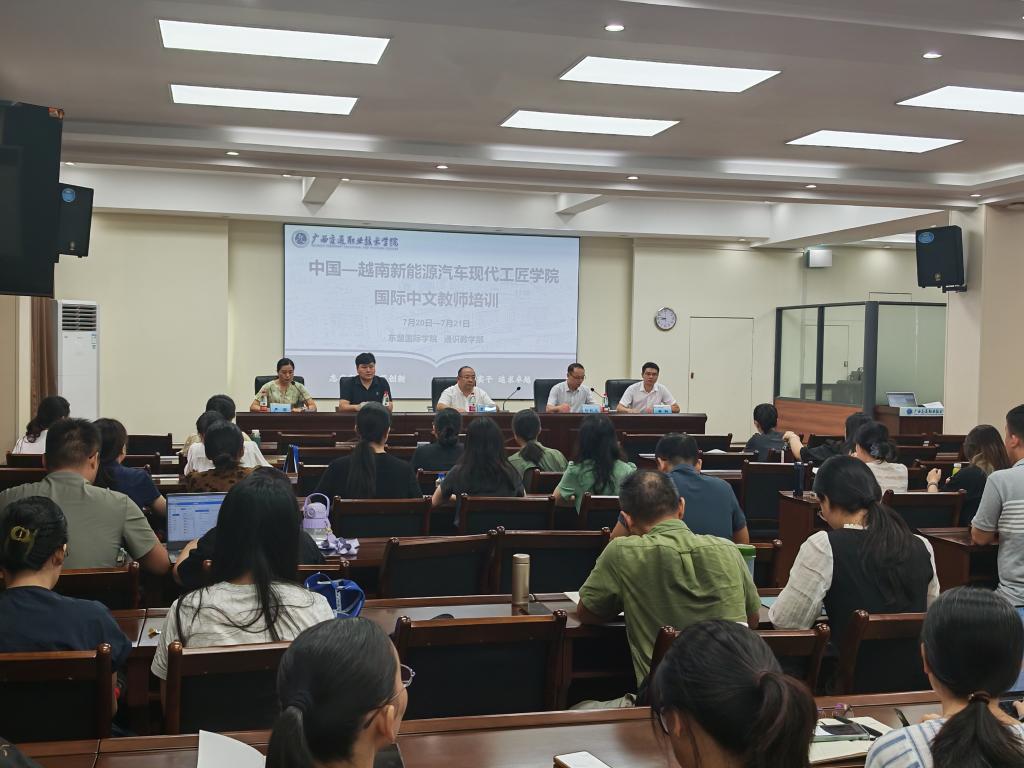 2025年7月20日上午,中国—越南新能源汽车现代工匠学院国际中文教师培训班开班仪式在广西交通职业技术学院园湖校区隆重举行。培训由东盟国际学院联合汽车工程学院、通识教学部共同举办,广西高等教育学会外国留学生教育管理专业委员会理事长覃成强教授、汽车工程学院、通识教学部和东盟国际学院领导出席开班仪式。