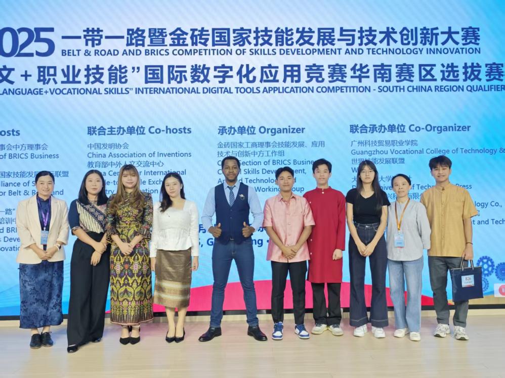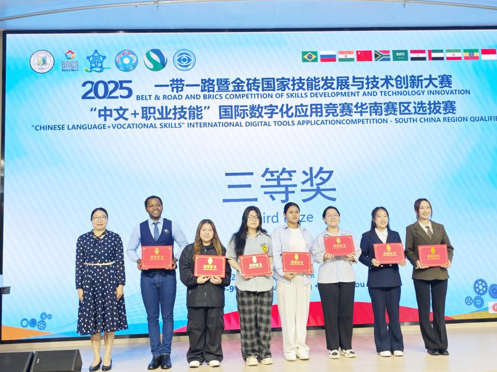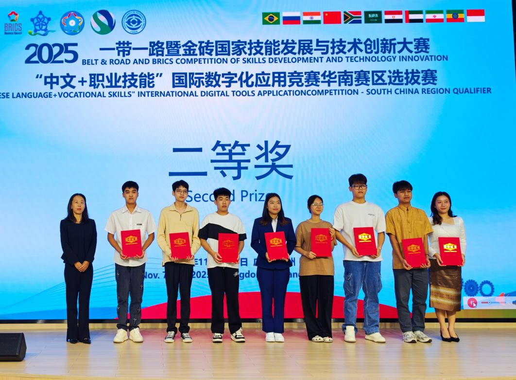 11月9日,2025一带一路暨金砖国家技能发展与技术创新大赛之“中文+职业技能”国际数字化应用竞赛华南赛区选拔赛在广州落下帷幕。我校国际学生代表队凭借卓越表现,一举斩获一等奖5项、二等奖2项、三等奖1项,展现了我校国际学生卓越的综合素养与国际化培养的扎实成果。