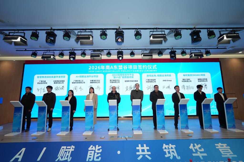 (东盟国际学院 范星硕/文)2026年1月22日,由自治区园区办、自治区数据局、南宁市政府联合主办的“AI赋能 共筑华章—2026年南A东盟谷项目签约仪式暨项目路演对接会”在南A中心举行,自治区园区办党组成员、自治区园区投促中心党委书记、主任肖潇出席会议并致辞,南宁市委常委、副市长张小强做园区推介。我校副校长邱实出席会议并与马来西亚企业就“自动驾驶物流车及智能网联汽车教学实训装备开发项目”签署合作协议。