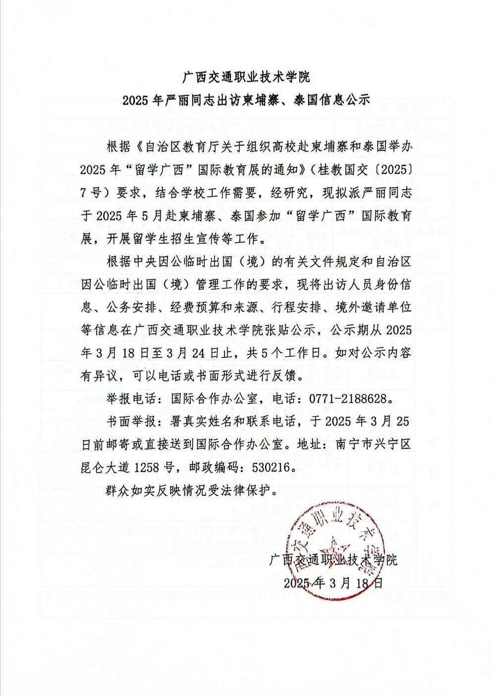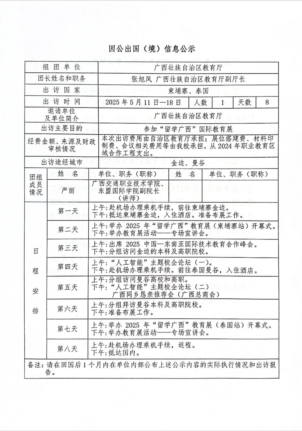 广西交通职业技术学院2025年严丽同志出访柬埔察、泰国信息公示