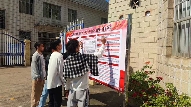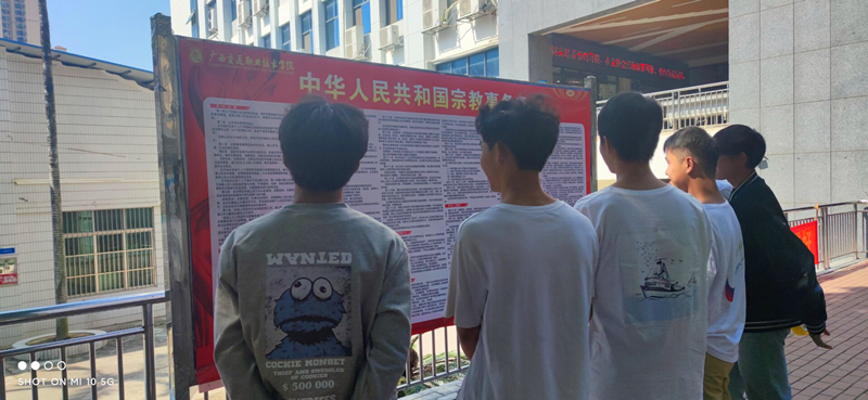 (航海工程学院 讯 董小夏/文、图)航海工程学院党总支在广西交通职业学院(相思湖校区)自11月14日起开展关于《中华人民共和国宗教事务条例》和《中国共产党统一战线工作条例》的展板宣传活动,贯彻落实学校党委统战部要求,营造全院师生认可统战、学习统战、支持统战的浓厚氛围。