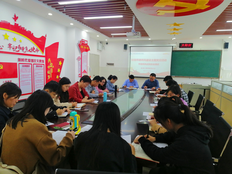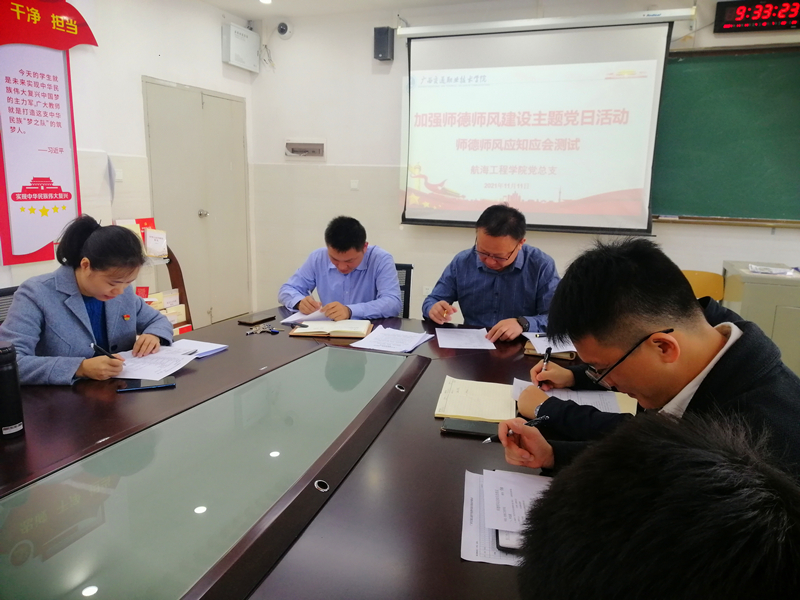 (航海工程学院 讯 严丽/文、图)为提升师德师风建设水平,检验学院师德师风教育效果,2021年11月11日,航海工程学院党总支在实训综合楼604开展加强师德师风建设主题党日活动,组织学院全体教职工参加师德师风应知应会测试。