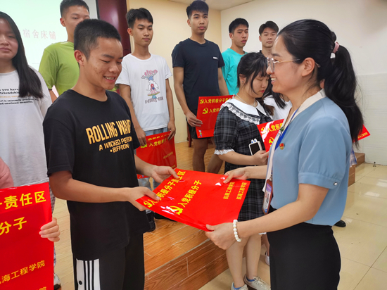 学生党支部书记严丽说:我们学院有多种类型的宿舍,如学习型、体育型、艺术型等,你们的宿舍属于哪一种呢?同学们作为同学中的先进代表,必须严格要求自己,把学院的工作要求落实到位,切实在学习、工作和生活中起模范带头作用。希望在座的各位能在宿舍中起到积极带头作用,把宿舍建设往更好的方面发展。在上课迟到、宿舍晚归中不要出现你们的名字;学院举办的各项活动、上台领奖等出现更多你们的身影。今天授予你们“入党积极分子”名牌、让你们在宿舍里面“贴牌”、划定责任区,是为了进一步增强责任意识和担当意识,希望同学们不负党的期望,坚定理想信念,用实际行动表达自己入党的决心,积极向党组织靠拢。紧接着是严丽老师和董小夏老师授予入党积极分子名牌,在这一过程中有同学说:贴在宿舍门口,整个宿舍都是我的责任范围,我有信心做好!