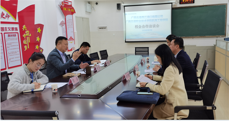 (航海工程学院教工支部 讯 谭菲、江丽萍/图文) 近日,广西北港西江港口有限公司党委副书记曾东兴一行4人到相思湖校区综合实训楼604召开了校企合作洽谈会,航海工程学院院长唐锋、党总支书记林燚宁及相关老师参加了本次会议。