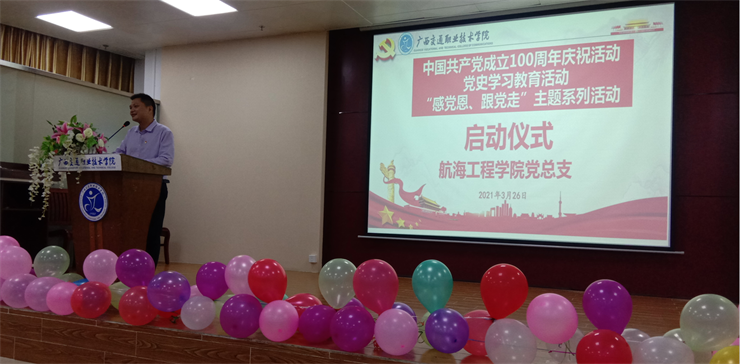 (航海工程学院党总支讯 图文/江丽萍) 2021年是中国共产党成立100周年,习近平总书记说,党的历史是弘扬社会主义核心价值观,开展革命传统教育和爱国主义教育的生动教材。为了增强我院全体党员的党性意识,从党史中汲取思想的力量、信仰的力量、道德的力量、实践的力量,航海工程学院党总支于3月26日晚在相思湖校区实训楼402举行了中国共产党成立100周年庆祝活动党史学习教育活动“感恩党、跟党走”主题系列活动启动仪式。党总支全体党员参加了此次启动仪式。