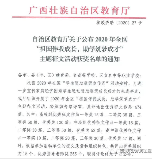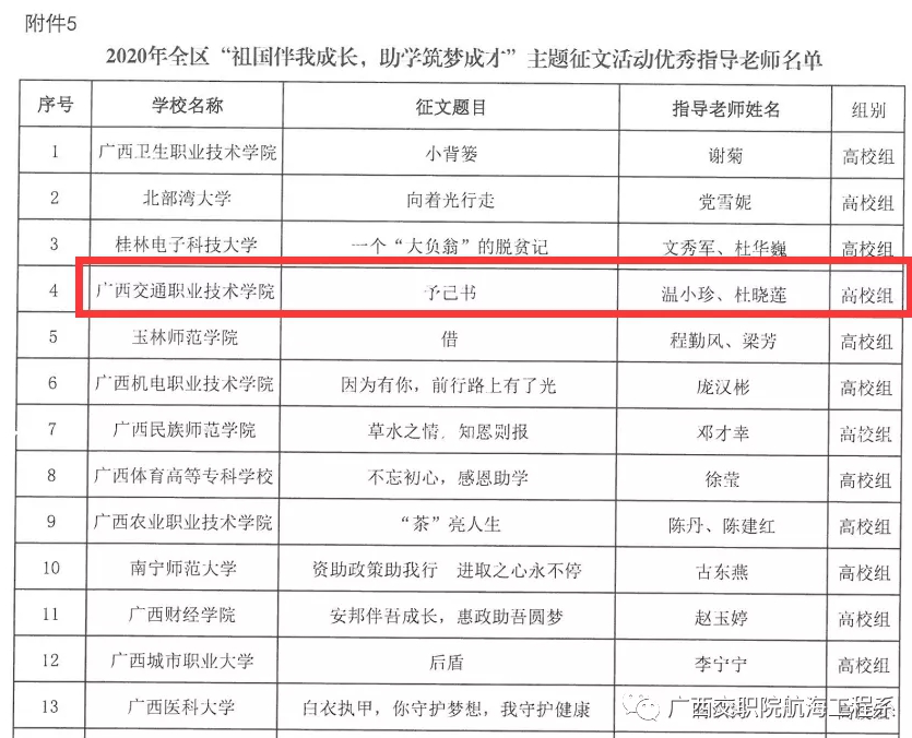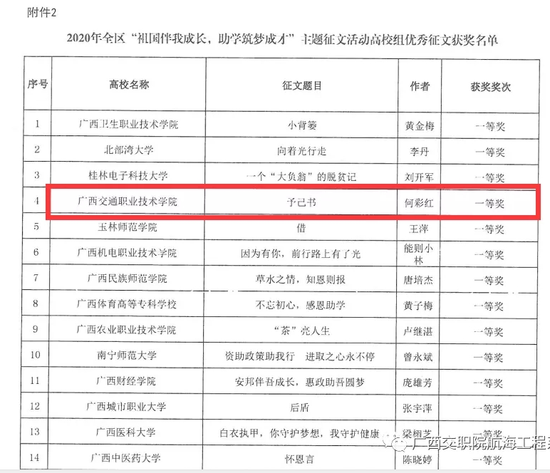 (航海工程学院 讯 江丽萍 温小珍/文) 根据2020年全区“学生资助政策宣传月”活动的安排,进一步宣传家庭经济困难学生通过资助政策成长成才的先进事迹,我院学生干事温小珍老师指导国际邮轮专业2018-1班何彩虹的《予己书》荣获“祖国伴我成长,助学筑梦成长”的主题征文比赛中脱颖而出,荣获高校组优秀征文作品一等奖。