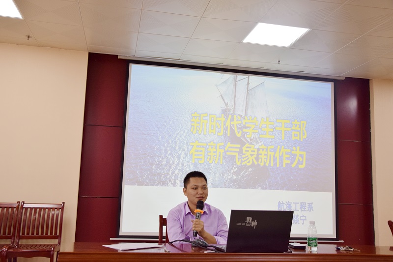 本次讲座由航海工程系党支部林燚宁副书记主讲。林燚宁副书记用“新时代学生干部,有新气象新作为”作为讲座的核心主题,从对学生干部的认识和为什么要提升学生干部的教育管理两个方面阐述了新时代学生干部要有新气象新作为。他指出:“新时代学生干部要始终不忘初心、牢记使命、永远奋斗。党的十九大报告开宗明义指出,不忘初心,方得始终。我们共产党人的初心和使命,是为人民谋幸福,为民族谋复兴,为同学服务,这是激励我们不断前进的根本动力。作为学生干部,我们一定要坚决响应习近平总书记的号召,向习近平总书记学习,不忘初心、牢记使命、永远奋斗。要牢牢扭住世界观、价值观、人生观这个总开关,始终坚定共产主义和中国特色社会主义理想信念”。
