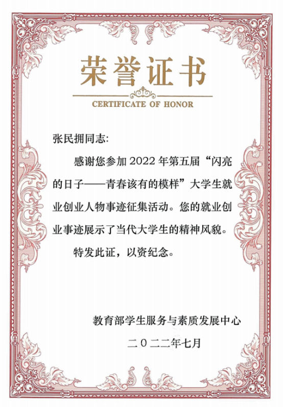 (航海工程学院 讯 王虎平/文)近日,由教育部学生服务与素质发展中心主办的第五届“闪亮的日子—青春该有的模样”大学生就业创业人物事迹征集活动公布结果,我校航海工程学院2021届毕业生张民拥的事迹获得表彰。