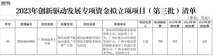 (航海工程学院 讯)近日,广西壮族自治区科学技术厅公布广西科技重大专项绿色高效平陆运河建设“尖锋”专项正式立项名单。由广西北部湾国际港务集团牵头,我校参与联合申报的《绿色标准船型设计制造关键技术研究及应用》获批立项,立项资助总经费750万元。项目分为三个专题,我院唐锋院长、赵代娣老师带领的科研团队负责专题三“平陆运河绿色江河海联运标准船型关键技术研发及示范”的“船舶流动污染源监测装置研发、课题教学示范基地建设”,并参与专题二“平陆运河标准船型船舶大型复杂结构智能制造关键技术及装备研发”研究。