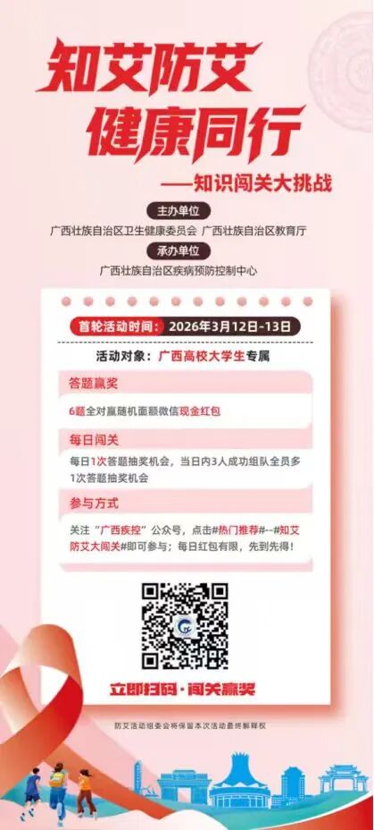 参与方式:关注广西疾控公众号→热门推荐→知艾防艾大闯关