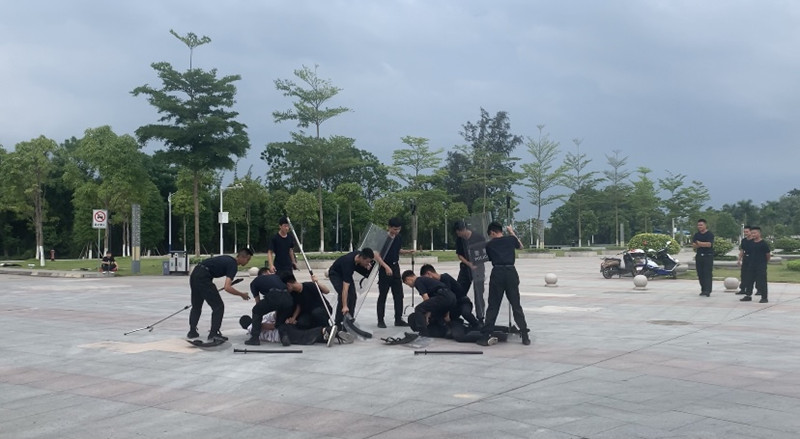 保卫人员黄文佳老师从近期典型暴恐事件着手,注重理论和实践融合,围绕突发事件处置流程、措施、注意事项等展开培训。在模拟演练环节,保卫人员讲解、演示了对讲机、警棍、盾牌、防暴叉等警械器材地使用,包括警棍盾牌防暴钢叉配合训练、多人配合训练、多人制服训练、防暴阵型等攻防技能。