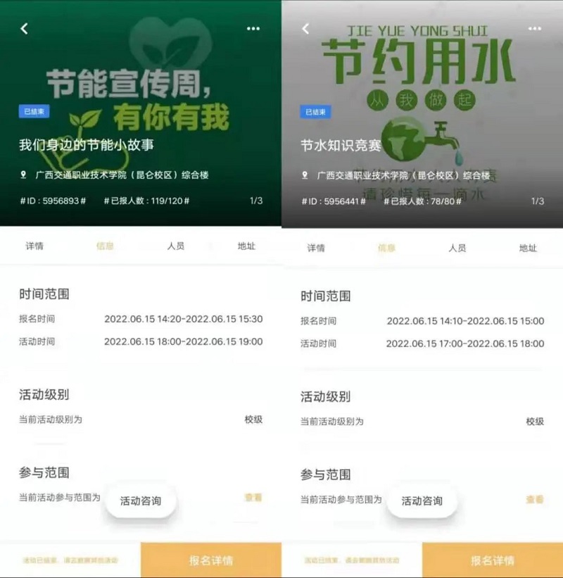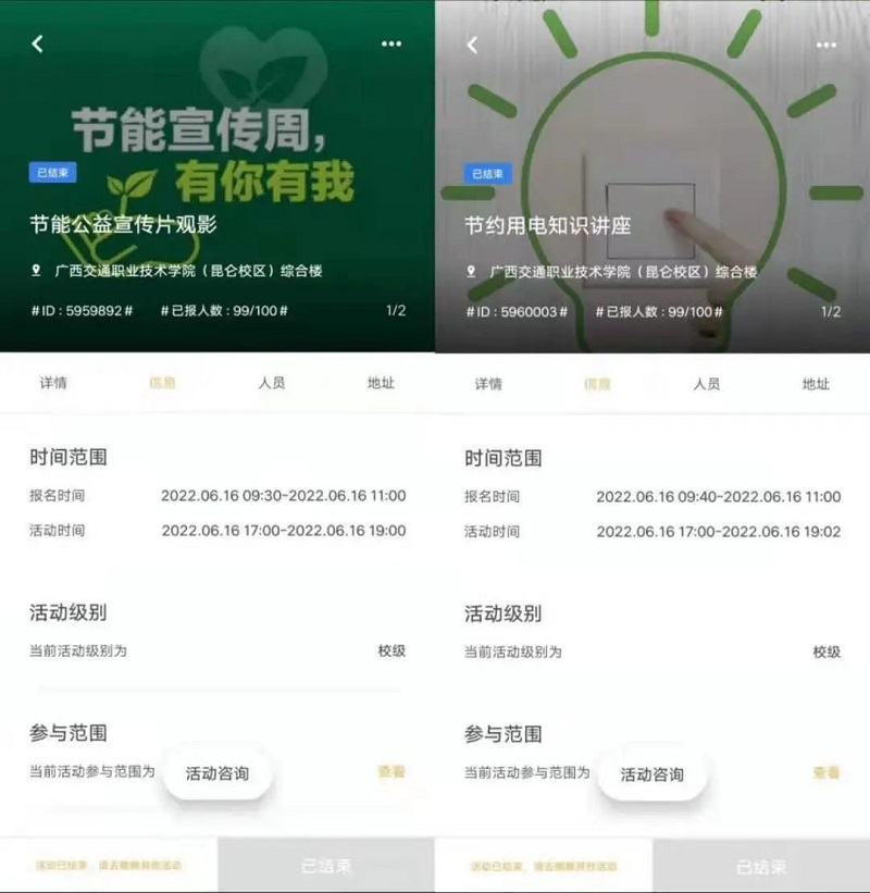 为响应区交通厅、区教育厅关于开展2022年全国节能宣传周和全国低碳日活动的文件精神,后勤保障服务中心党支部联合春雨行动协会开展节水知识竞赛、我们身边的节能小故事、节约用电知识讲座、观看节能公益宣传片、爱粮节粮专题讲座等主题宣传活动。