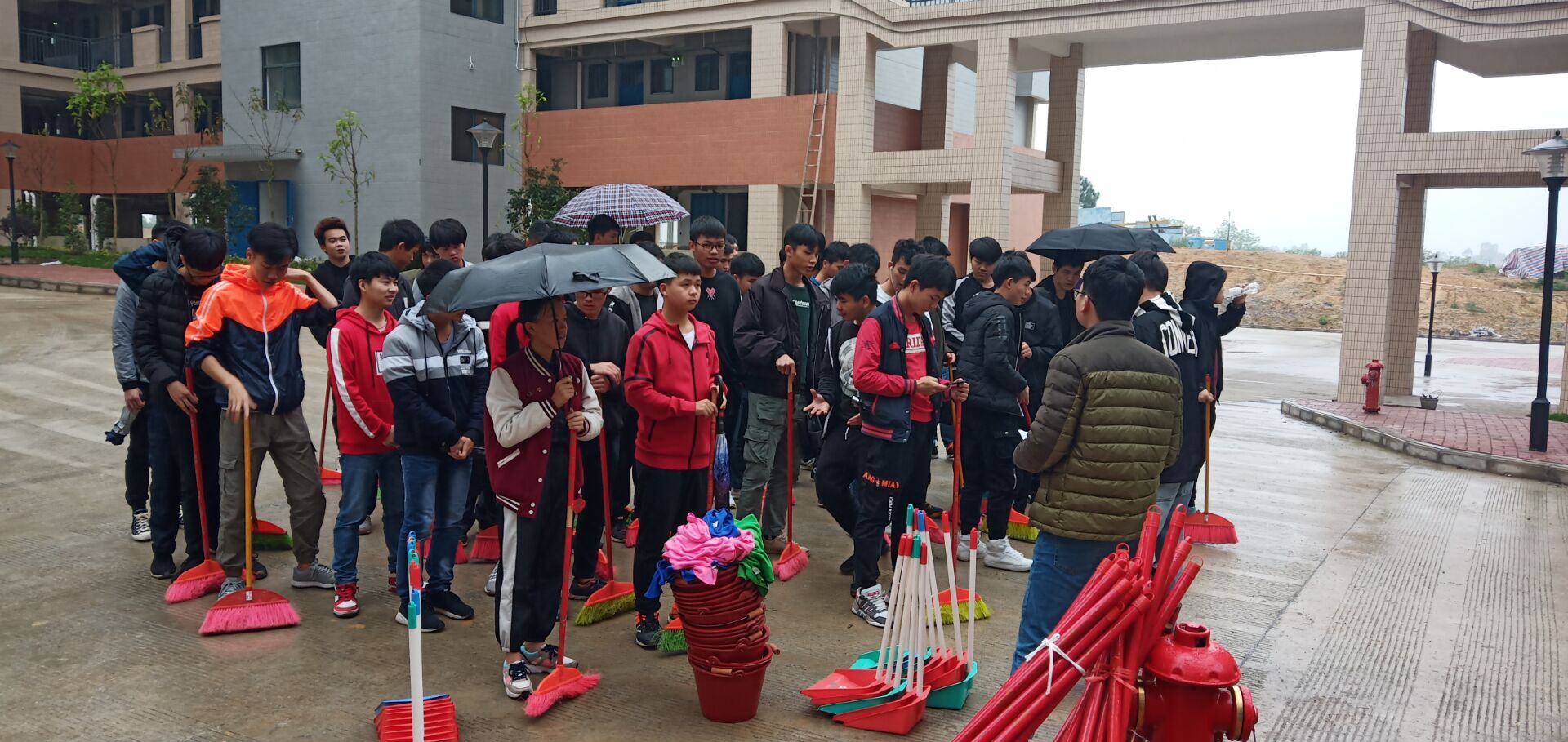 学生在听老师讲解打扫要求