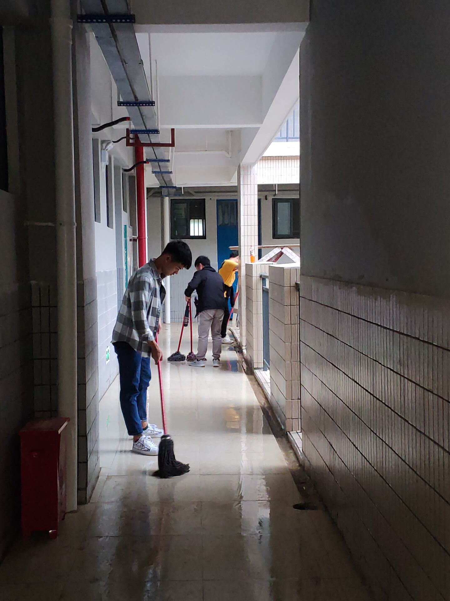 活动开始前,后勤保卫处负责保洁的老师提前划分了工作区域并提出了详细的卫生清洁标准,保证清洁不留死角。参加打扫的同学们非在老师简单讲解之后,4人一组,在保洁阿姨的指导下,分工协作,有的用拖把拖厕所,有的用抹布擦窗台,有的用铲子铲除楼梯和绿化带里的建筑垃圾,有的清扫楼道上的垃圾,同学们根据要求井然有序开展保洁工作。期间,汽检2018-7班的李世泳同学擦拭着头上的汗水说:“自己的事情自己做好,累并快累着,付出的汗水都值得,希望以后能多组织类似的活动”。在同学和保洁阿姨的不懈努力下,新公寓终于披上干净的外衣。