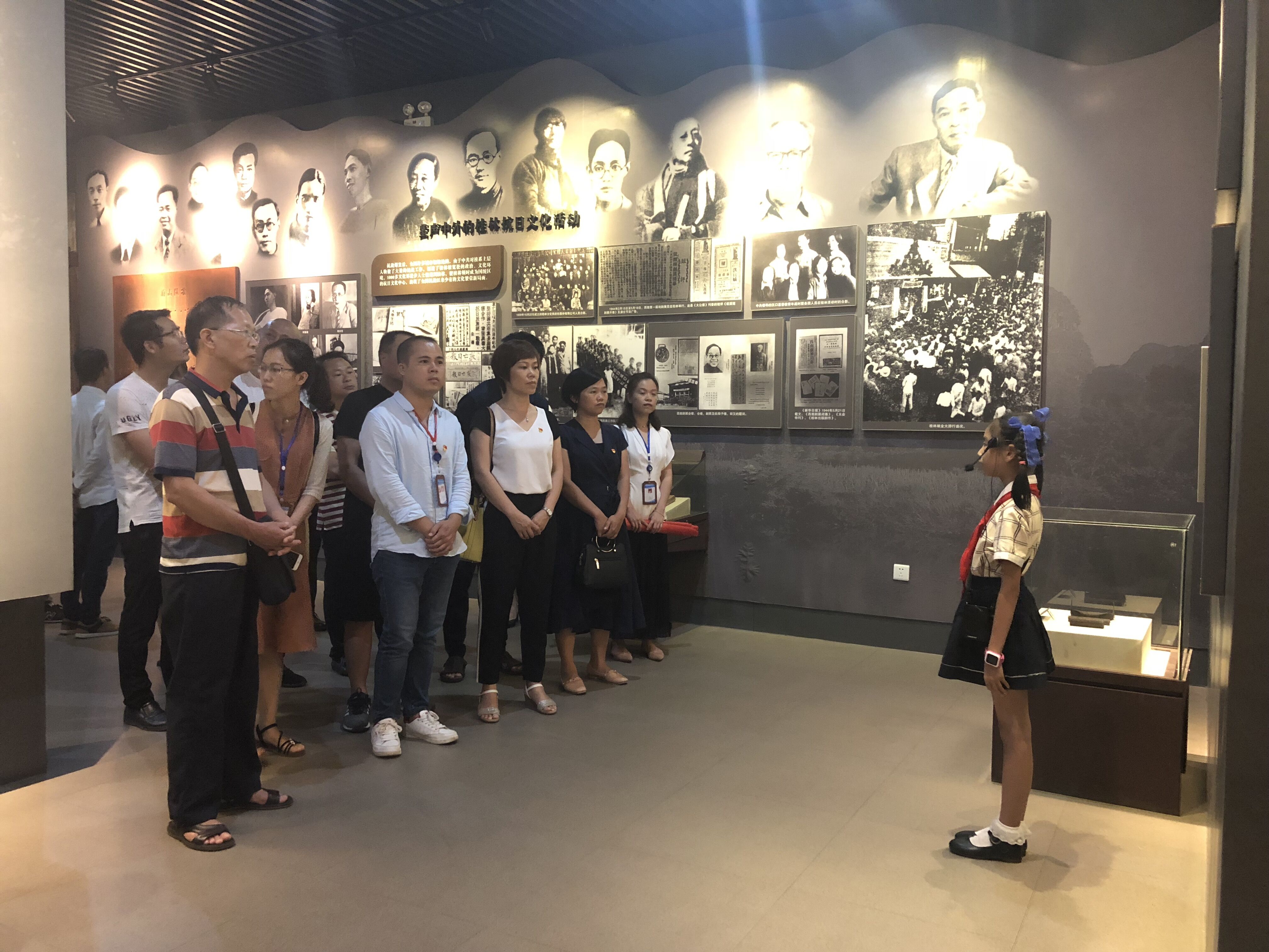 在革命纪念馆内,全体党员佩戴党徽,在党旗下庄严地举起右手,重温入党誓词,牢记自己作为党员的神圣使命和庄严承诺。广西革命纪念馆主要展出中国共产党在广西的革命斗争历程和著名英烈事迹,陈列图片近千幅、革命文物数百件、画作和雕塑作品20多件。本次纪念馆的讲解工作由可爱的4名小学生负责,他们声情并茂、绘声绘色的为大家讲解馆内“新民主主义革命时期”、“社会主义革命时期”、“八桂将星和八桂英才”、“洒向壮乡都是爱---党和国家领导人关爱广西”四大版块的内容,全体同志都被小讲解员的精彩内容所吸引。听完讲解,全体党员在爱心书屋认真阅读有关中国共产党发展的书籍并进行现场讨论。