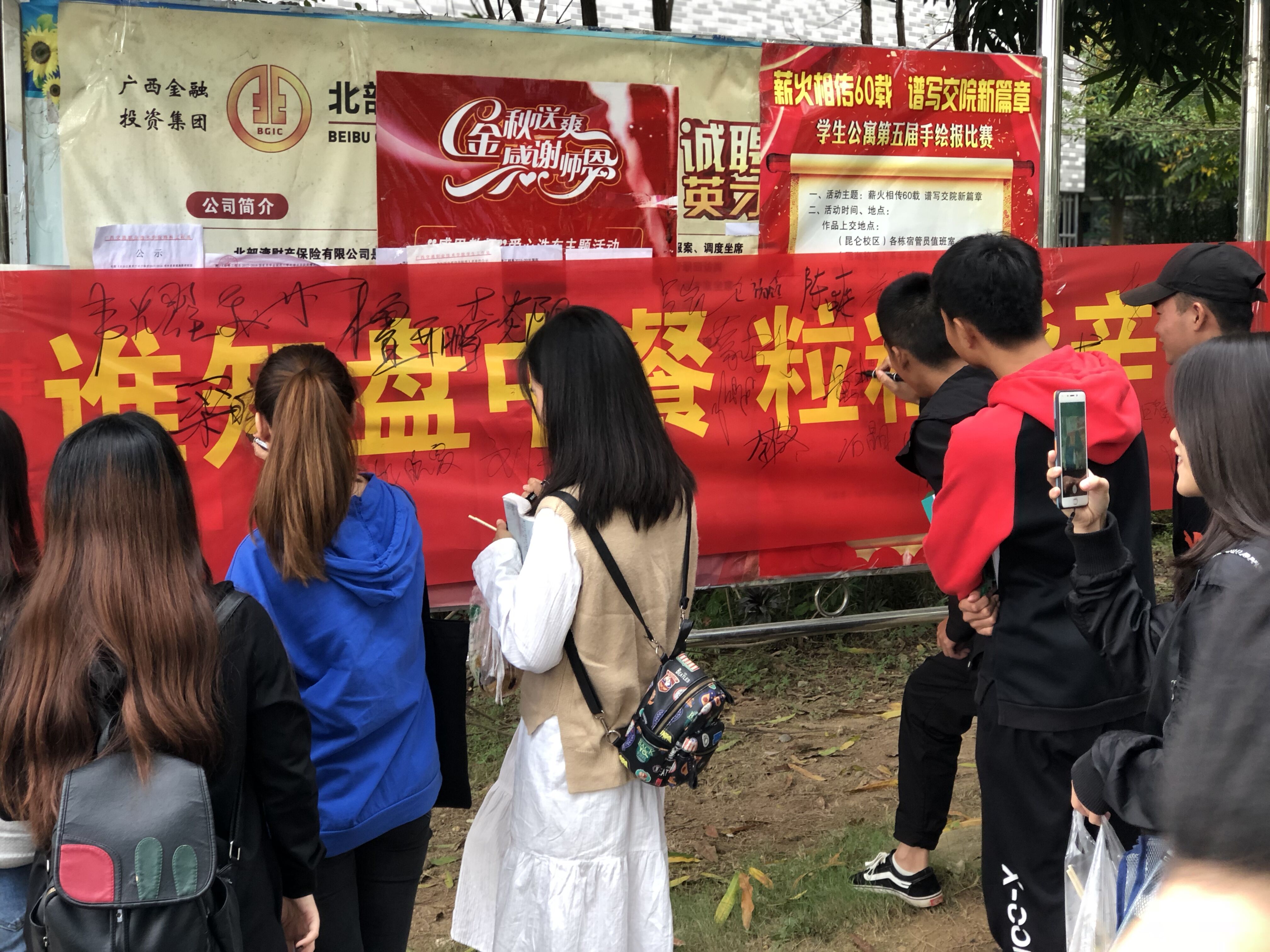 在活动现场,工作人员通过签名倡导、发放宣传册、海报宣传等形式积极开展节粮宣传,进一步提高学生爱惜粮食、节约粮食的行动力,带动身边的同学共同参与“爱粮节粮”行动。过往的师生们纷纷驻足签名,向工作人员了解“10.16.世界粮食日”的由来,仔细阅览宣传手册,从中感受绿色校园并树立“节能节粮从我做起”的理念。路桥工程系辅导员李丽晶老师在宣传版上一边署名一边说到:“这样的活动可以让广大师生深入了解世界粮食日的来历,让节约成为一种生活方式,非常值得提倡和推广。”园林2018庞俊富同学说:“谁知盘中餐粒粒皆辛苦,光盘行动不是一句口号,我们每个学生应当从身边做起,共同创建节约、文明、美丽的交院食堂。”