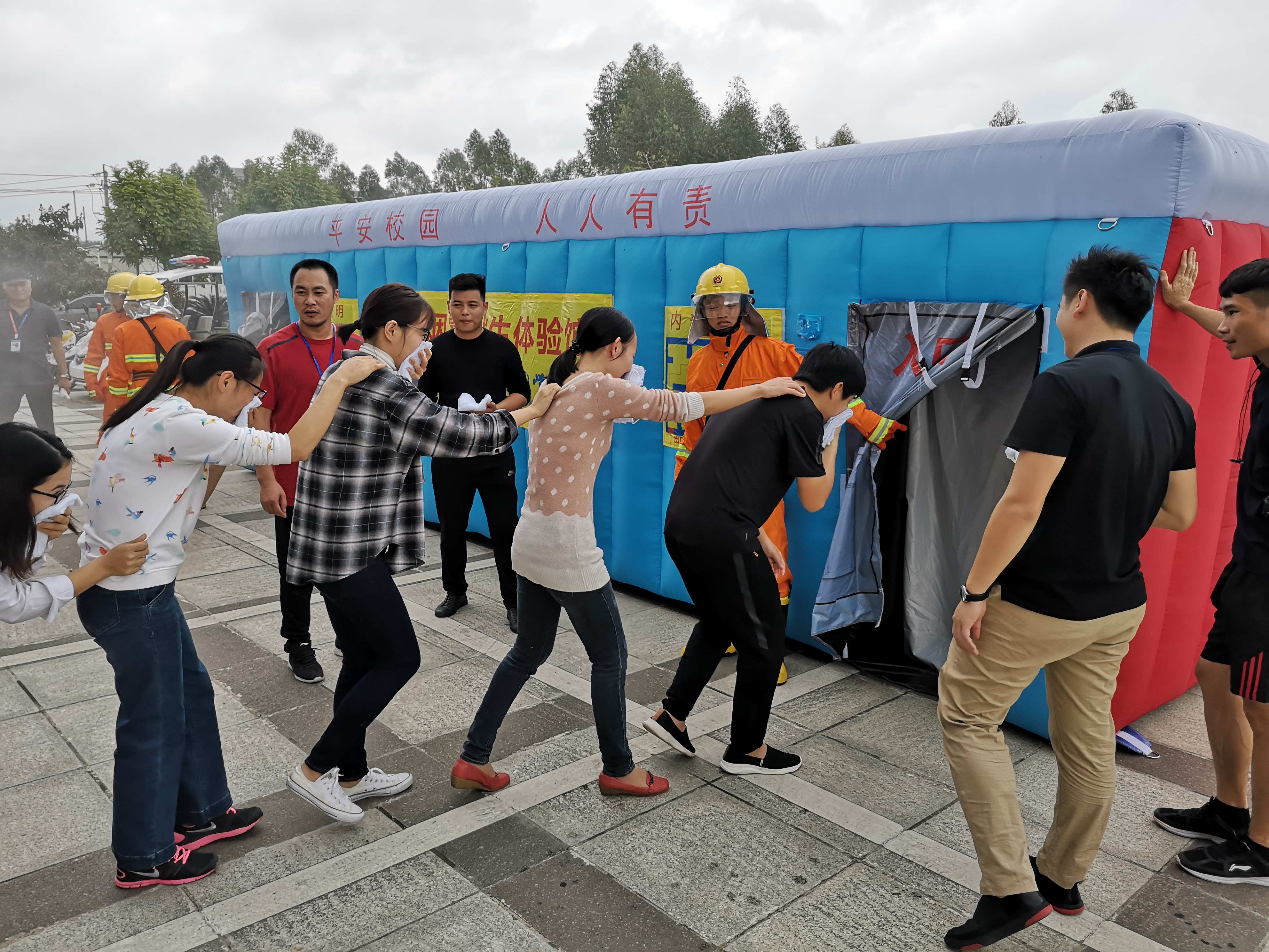 教职工有序进入烟道逃生演练屋