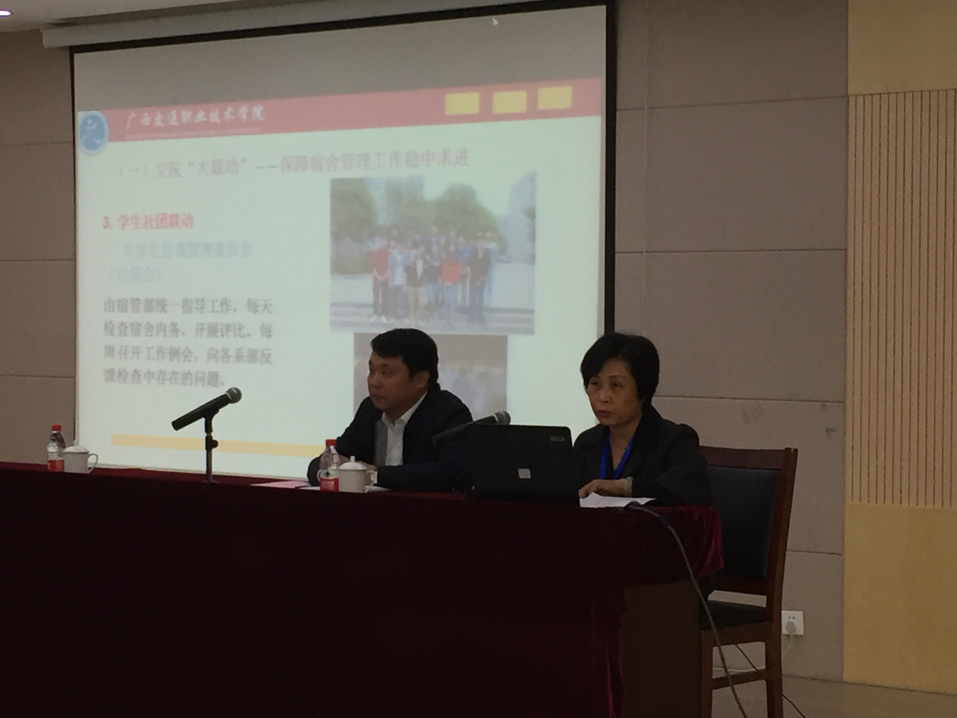 韦红教副院长应邀参加了专题小组讨论,与10多所兄弟院校分管领导针对后勤工作的现状和发展进行探讨,充分打开后勤工作的新思路。后勤保卫处负责人在会议上做学生宿舍管理工作专题报告。她重点从联动管理模式、“家”文化创建、智慧后勤、队伍建设以及宣传工作5个方面介绍我院在宿舍管理工作中取得的成就,获得兄弟院校的一致好评。