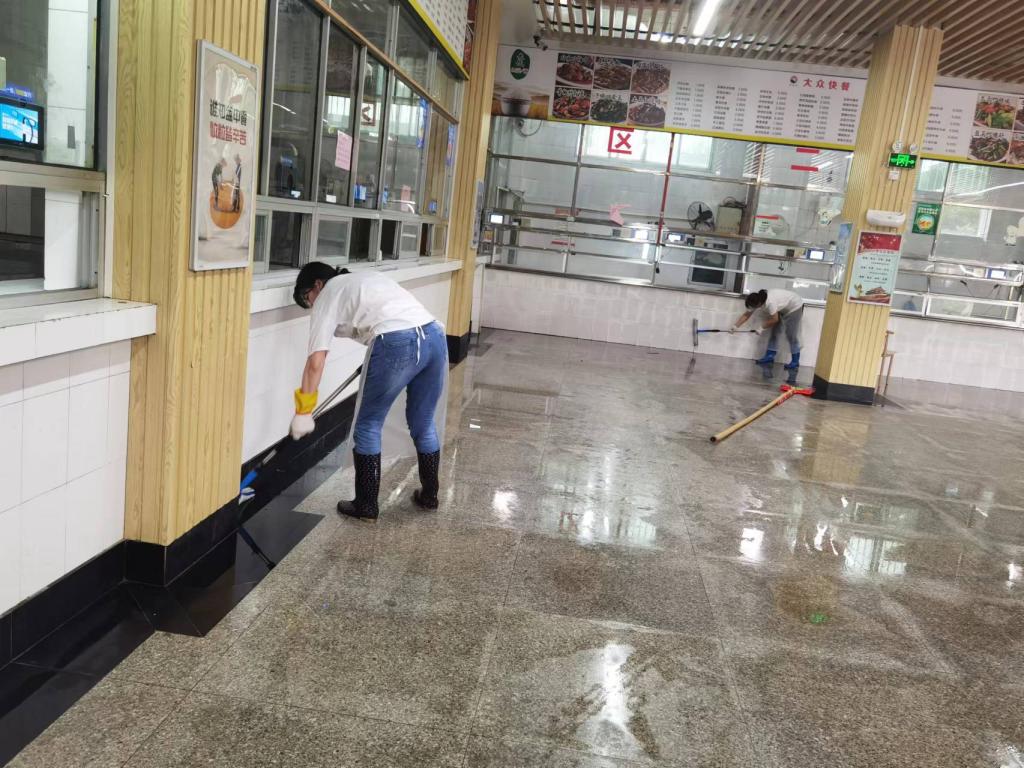 园湖校区、昆仑校区各食堂组织员工们对食堂进行了全面的清洁,包括地面、墙壁、卫生死角、桌子和餐具等场所清洁。为了防止病菌的传播,食堂人员根据卫生部门的相关要求对后厨、用餐区域、库房及四周进行了全面的清洁和消毒,为全校师生提供了一个干净、整洁、舒适的就餐环境。