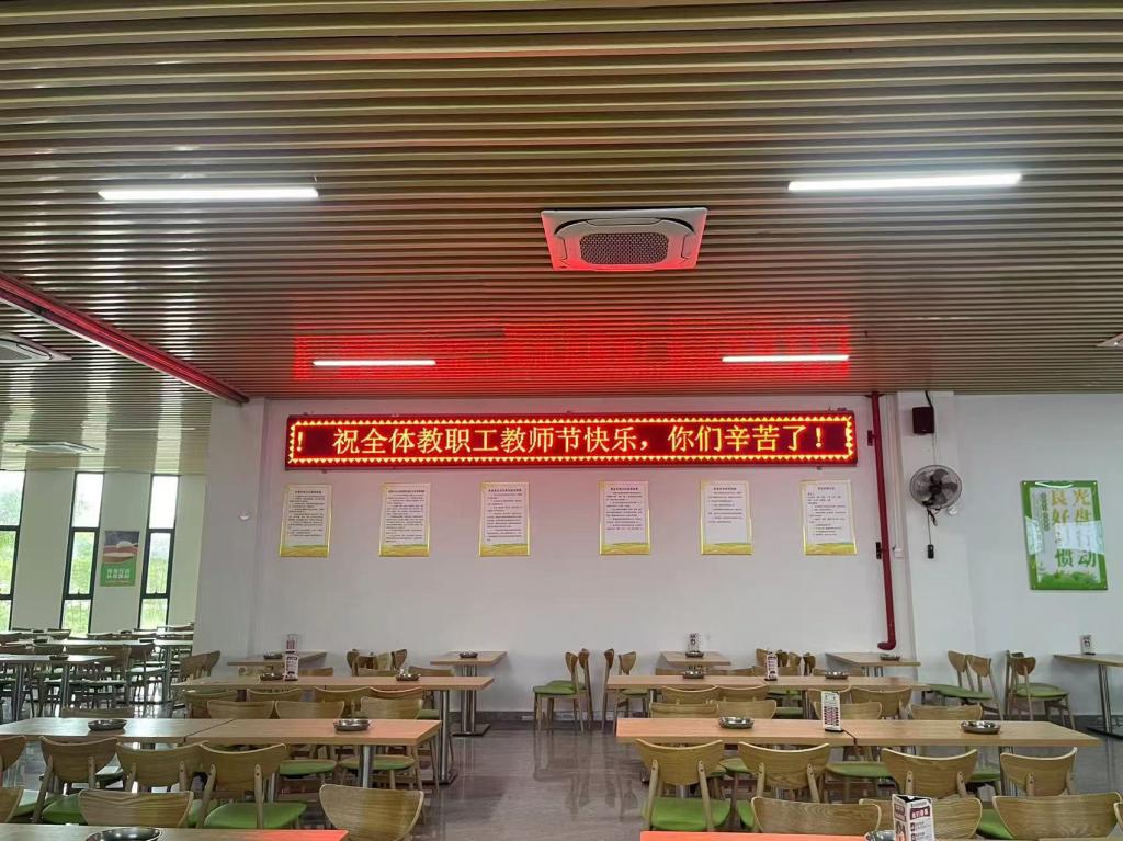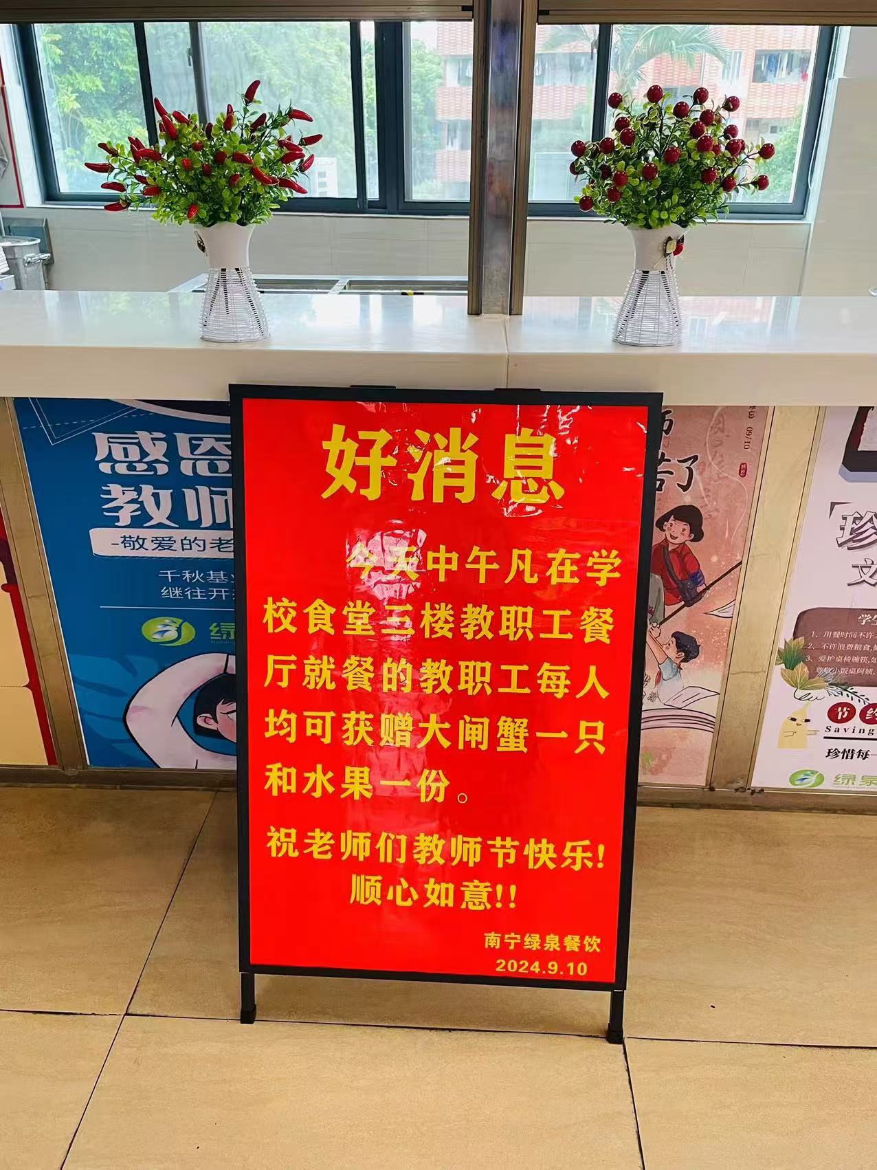 (后勤保障服务中讯 王宇冰文/图)9月10日,是第40个教师节,在这个充满感恩与敬意的教师节,我校昆仑校区、园湖校区各食堂、餐饮店精心筹备,开展了教师节感恩活动,以表达对教职工们辛勤付出的感激之情。教师节当天,各食堂、美食广场利用电子屏幕、悬挂宣传横幅等形式为教师“亮灯”,向教职工们送上节日祝福,营造了浓厚的节日氛围,让教职工们感受到节日的喜悦与幸福。