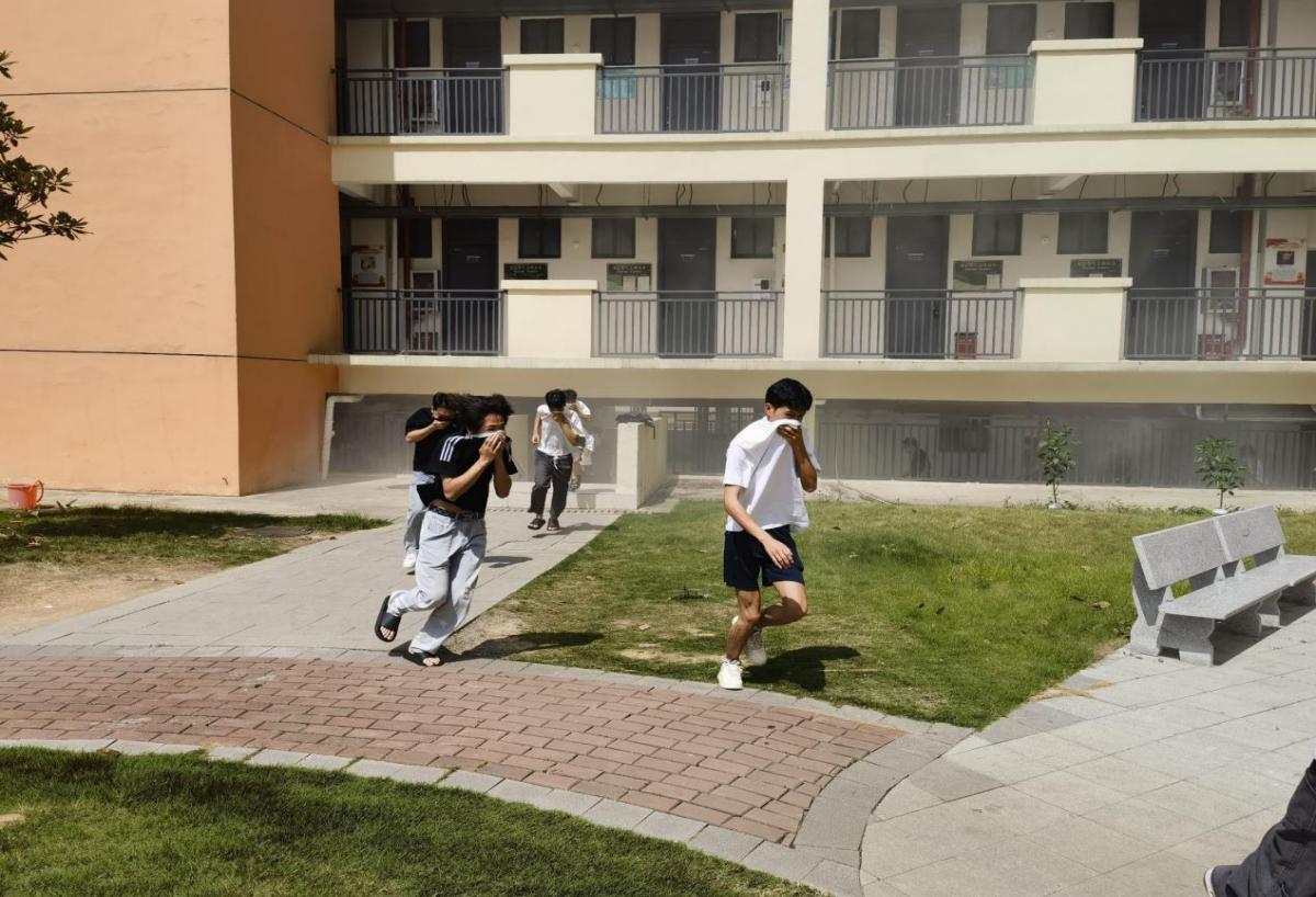师生在宿舍区参加逃生演练