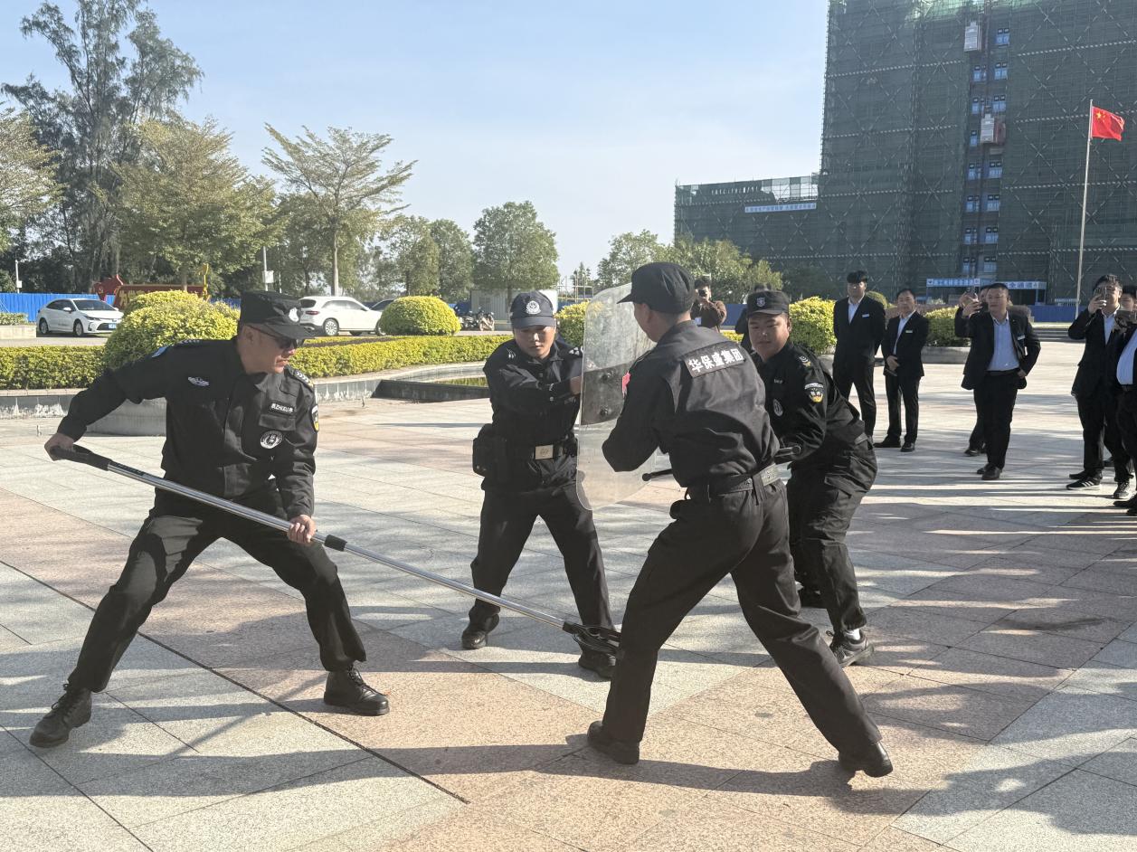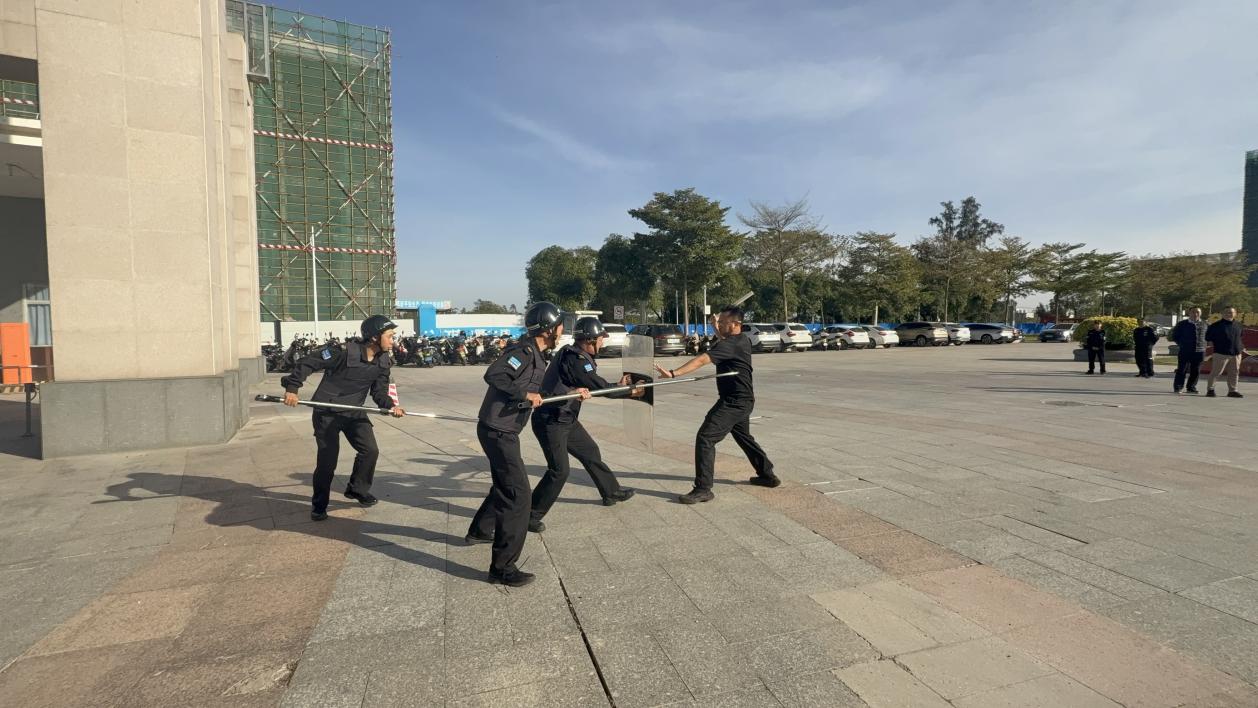 三塘派出所民警现场讲解盾牌、防暴钢叉、橡胶棍等器械的使用方法、攻防技巧及注意事项。模拟实战环节中,应急防暴组、疏散组在民警指导下各司其职、协同配合,攻防动作规范实用,处置高效,充分展现了校园安保队伍的专业素养。