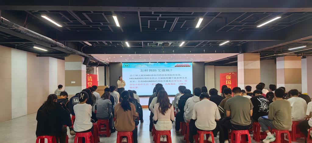 (后勤保障服务中心(保卫处)讯 黄省文/图)12月1日是第38个“世界艾滋病日”,为响应“健康中国2030”行动号召、筑牢校园健康防线,我校后勤中心于近日在昆仑校区青年活动中心举办“青春防艾 知识先行”主题讲座。特邀南宁市第四人民医院黄田医生主讲,300余名师生代表到场参与。