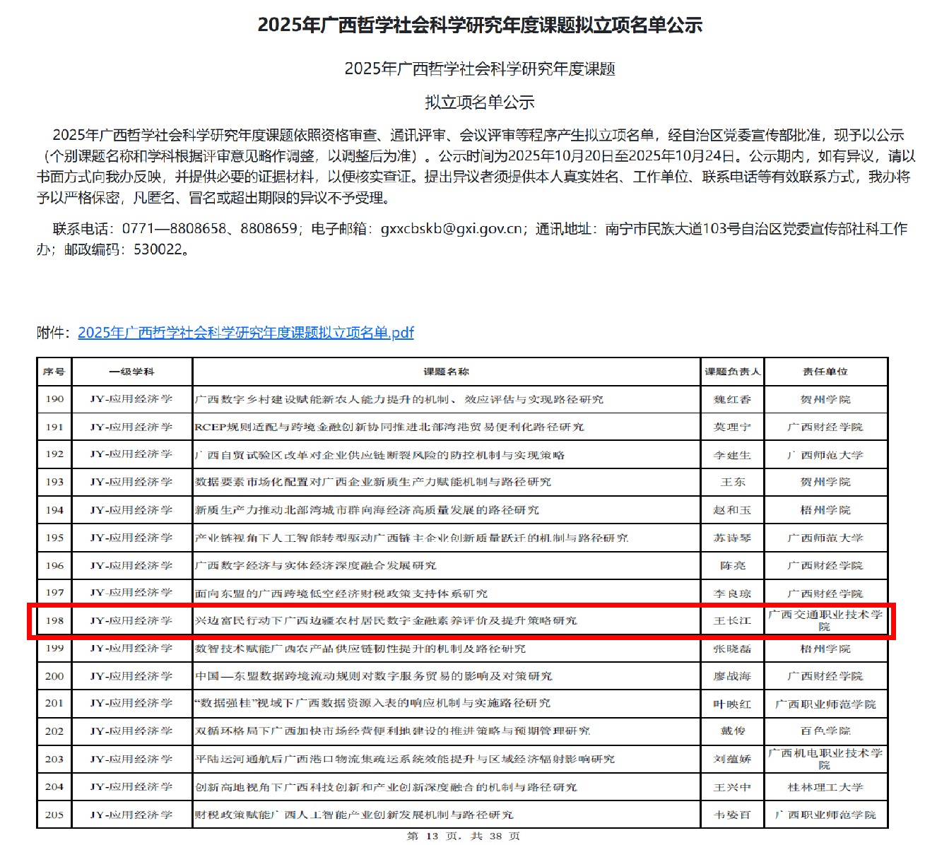 10月20日,广西壮族自治区哲学社会科学工作办公室公示了2025年广西哲学社会科学研究年度课题拟立项名单,名单显示我校王长江老师的项目入选。
