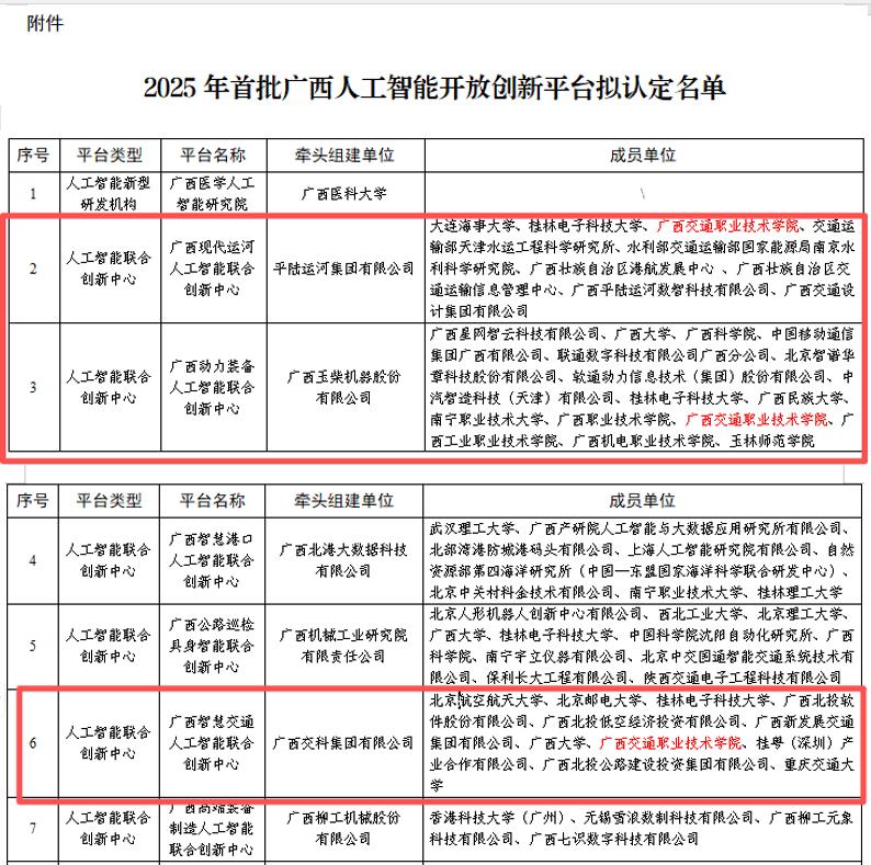 10月31日,从广西壮族自治区科学技术厅《关于公布 2025 年首批广西人工智能开放创新平台名单的通知》(桂科发〔2025〕431号)传来喜讯:我校成功获得3个广西人工智能开放创新平台。