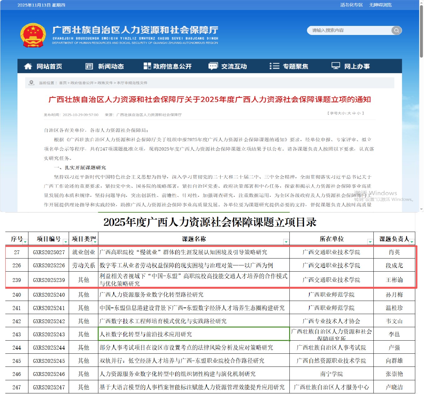 10月29日,自治区人力资源和社会保障厅公布了2025年度广西人力资源社会保障课题立项目录,我校肖英、段成龙及王彬渝老师的课题获得立项,涵盖就业创业、劳动关系等领域,体现了学校在服务区域人社发展与职业教育研究方面的积极探索。