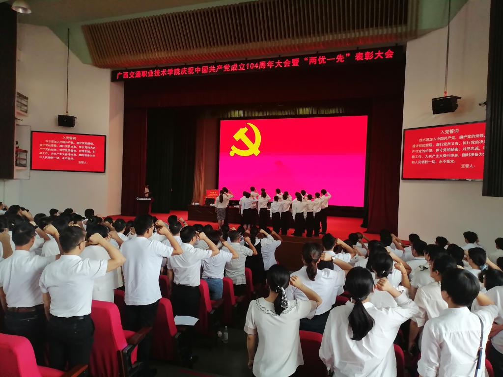 (党委办公室、宣传部 讯 梁静芸、郑枢/文)奋斗未有竟时,赶考永不停歇。7月1日下午,学校庆祝中国共产党成立104周年暨“两优一先”表彰大会在园湖校区大礼堂隆重举行。学校党委书记陈湘如在大会上作主旨讲话,号召全校党员以更加饱满的热情、更加昂扬的斗志、更加务实的作风,深化改革谋突破,转型发展开新局,为加快创建交通职业技术大学,谱写新时代壮美广西建设的交院篇章而团结奋斗!