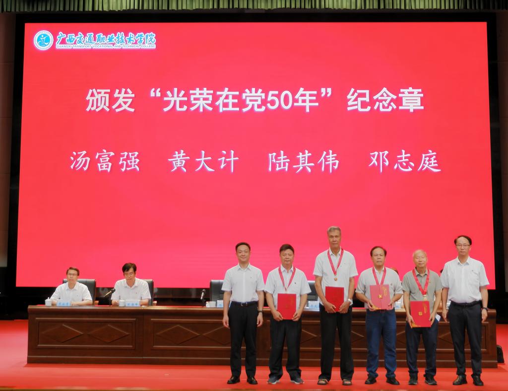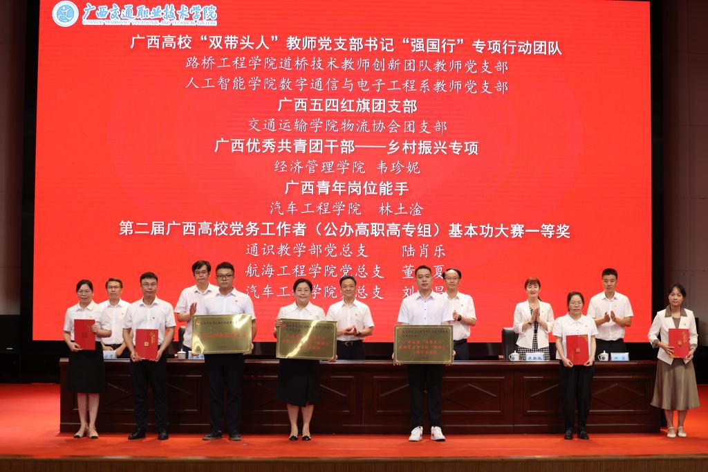 会上,学校党委副书记陈海峰宣读了表彰文件,并举行隆重的颁奖仪式。陈湘如、李文勇为“光荣在党50年”的老党员颁发纪念章,与会校领导为获得教育部立德树人机制综合改革试点单位、全国高校“双带头人”教师党支部书记“强国行”专项行动团队、广西高校“双带头人”教师党支部书记“强国行”专项行动团队、广西五四红旗团支部、广西优秀共青团干部——乡村振兴专项、广西青年岗位能手的组织和个人进行了现场颁奖。