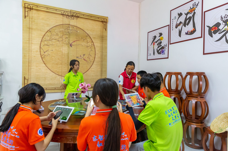 在学校定点帮扶信河村、纳雄村和天然村,大家促膝长谈,认真听取当地村委书记介绍地方发展脉络和乡村新貌,聆听老党员讲述红色故事;在“乡村主播”电商人才孵化基地,东兰学子化身小主播电商直播带货、进行AR互动式体验,共同见证家乡和时代的快速发展;在葡萄种植基地,营员们满脸好奇地询问葡萄的种类和生长方式,亲自体验果农的辛勤劳作,在劳动中体验快乐,感受乡村振兴的时代价值。