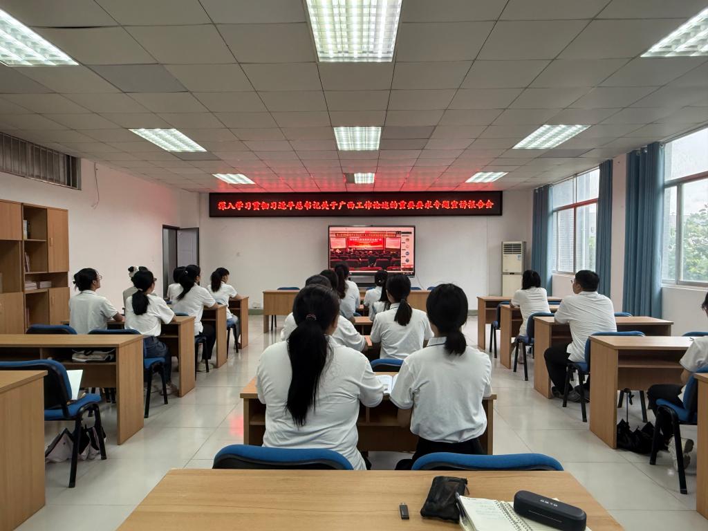 陈湘如书记以《凝心聚力建设新时代壮美广西》为题,从习近平总书记关心关怀广西发展、习近平总书记关于广西工作论述的重要要求的内容体系、新时代壮美广西的接续实践、学校推动高质量发展的生动实践等四个方面,深情回顾习近平总书记对广西的亲切关怀,系统阐述习近平总书记关于广西工作论述的重要要求的主要精神,全面解读了自治区党委、政府全面贯彻落实重要要求的系列部署和生动实践,并结合学校第二次党代会精神,深刻阐述了“强国建设、交院何为”的时代课题。