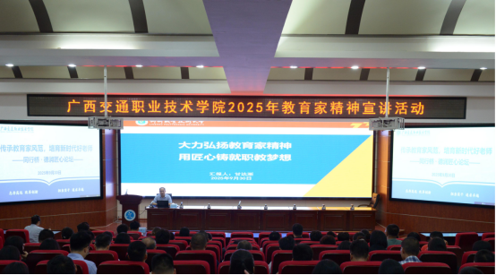 活动中,学校邀请到柳州职业技术大学机电工程学院党委副书记、国家级技能大师工作室负责人甘达淅教授为大家宣讲。甘教授以“大力弘扬教育家精神·用匠心铸就职教梦想”为主题,紧扣教育家精神“心有大我、至诚报国”的理想信念,为大家讲述了自己二十余载扎根教学一线,默默奉献职教事业的心路历程,用生动的语言和鲜活的案例诠释了教育家精神的时代践行。