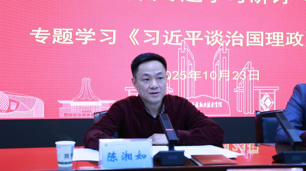 (党委宣传部 讯 周怡/文)10月23日上午,学校党委理论学习中心组2025年第4次学习会在路桥工程学院519会议室召开会议,专题学习《习近平谈治国理政》第五卷。学校党委书记陈湘如主持学习会并做导学,他强调,要深学思悟笃行《习近平谈治国理政》第五卷,增强学思想、悟思想、用思想的自觉性和坚定性,把学习成果转化为勇担强国使命、奋力争先进位,推动高质量发展提档升级的实际成效。